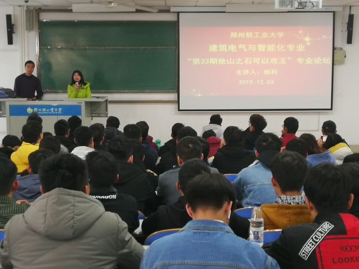 2019123日下午,建筑环境工程学院在科学校区三教楼106教室举办了建筑电气与智能化专业“他山之石可以攻玉”专业论坛第33期,邀请河南云门电子科技有限公司总经理杨利为2018级学生做“专业发展方向”讲座。