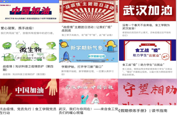 一是充分利用微信、抖音等新媒体平台加强防疫宣传,做好思想舆论引导。在这场没有硝烟的战“疫”面前,我院陆续创作出携手战“疫”、科普知识系列宣传、“战疫情”团日活动、打开学习新窗口、助力学生云就业等主题作品,展示学院抗疫服务工作、学生居家学习生活状态、志愿者抗疫事迹等,加强了疫情期间的思想政治引导,提高了学生战胜疫情的决心;二是“停课不停教”,上好开学思政第一课。我院辅导员通过抖音、QQ群、哔哩哔哩等多种直播途径,全覆盖开展了网络主题班会,引导同学们严守纪律、高度重视、科学防护、潜心学习,提高辨别能力、理性看待疫情。与此同时,辅导员们与大家积极互动,并就学生居家学习、生活、就业中的困难疑问进行答疑解惑。