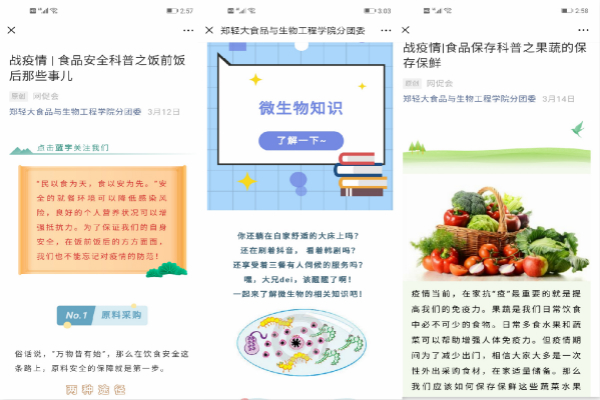 此外,我院充分整理、挖掘典型,通过微信公众平台,创作了“好声音、好故事”抗疫志愿者系列作品,宣传防疫抗疫工作中涌现的先进典型和感人事迹。并结合我院专业特点,推出战疫情|微生物知识科普和战疫“食”事系列推文,传播疫情防控和食品安全知识,引导师生健康生活,科学防疫。