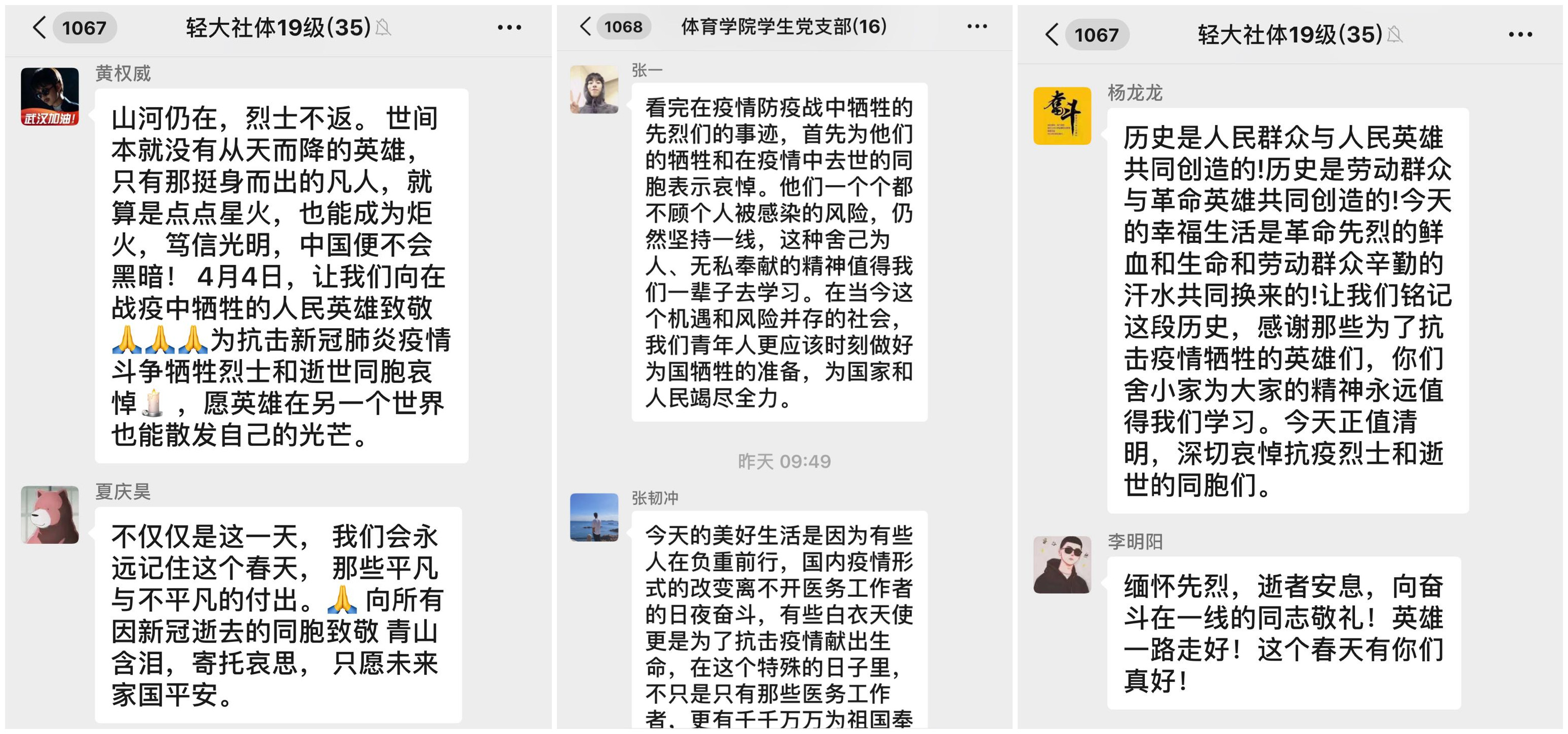 活动开始前,体育学院向师生发出了《网上扫墓祭英烈,我们一起行动!》的倡议书,并向广大团员青年发出了《“云追思,祭英烈,致敬抗疫英雄”致广大团员青年的一封倡议书》,倡导广大师生通过网上祭奠的方式进行清明祭扫。活动中,师生们登录“中国文明网”、“中华英烈网”、“河南文明网”、“郑州文明网”等网络平台,为英烈献花,进入陵园为烈士扫墓,了解烈士们为祖国为人民抛头颅、洒热血,不惜牺牲自己生命的感人事迹,向为国家富强而英勇献身的民族英烈和牺牲在战“疫”一线的英雄们致敬,表达追思缅怀之情。活动后,师生通过微信和QQ等平台发表追思感想,表达了自己对革命先烈的敬意,对在抗击新冠肺炎疫情中牺牲烈士和逝世同胞表达深切哀悼。
