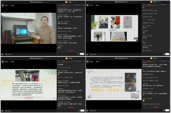 疫情发生以来,我院青年学子挺身而出,他们不畏艰险、勇于担当,主动请缨参与到所在村委或社区的疫情防控工作中。此次线上宣讲活动中,王宝雪、张大元、何心怡等13位在疫情期间参与志愿服务的同学依次为大家讲述了他们的战疫故事,分享了抗疫中的所见所思所感。在具体工作中,他们积极协助当地村社开展体温检测、人员排查、防疫宣传、群众疏导、消毒处理等工作,有的在寒风中坚强拿起手中的体温计;有的在不理解不配合的声音中执着的进行人员排查;有的不厌其烦的一次次为社区人员讲述防疫知识……一个个虽然微小却动人的故事,一句句发自肺腑的“我想在国家需要的时候,贡献出自己的一点青春力量”令同学们既敬佩又感动。大家纷纷在发言框留言,“尽绵薄之力,献赤子之心,你们都是最棒的,中国必胜”,“你们用爱心守护着万家安宁,正因为一个个无私奉献者的微光,才会将中国点亮”,“韶华不负,勇担责任,让青春在党和人民最需要的地方绽放绚丽之花”,一句句评论表达着对身边榜样的赞叹和对伟大祖国的热爱。