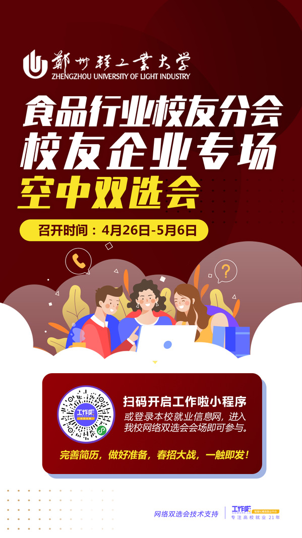 为进一步降低疫情对毕业生就业的影响,更好地助力毕业生就业,4月26日—5月6日,食品与生物工程学院联合校就业指导中心、食品行业校友分会通过工作啦智慧化精准就业平台开展“食品行业校友分会校友企业专场空中双选会”。