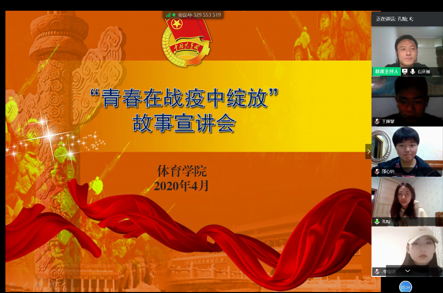 为了展示战疫志愿者的青春风采,营造向战疫志愿者学习的氛围,4月29日晚,体育学院在腾讯会议视频平台召开了“青春在战疫中绽放”故事宣讲会。体育学院分团委书记石庆福老师、全体团学干部以及各班级学生代表参加了此次宣讲会。
