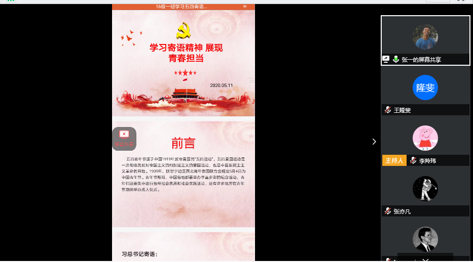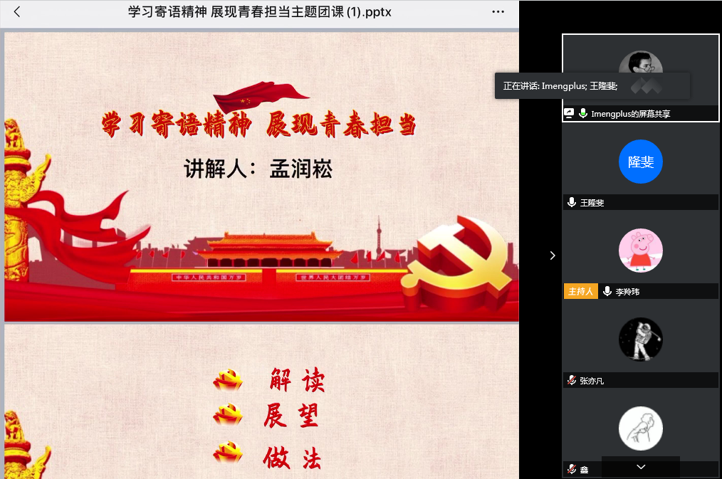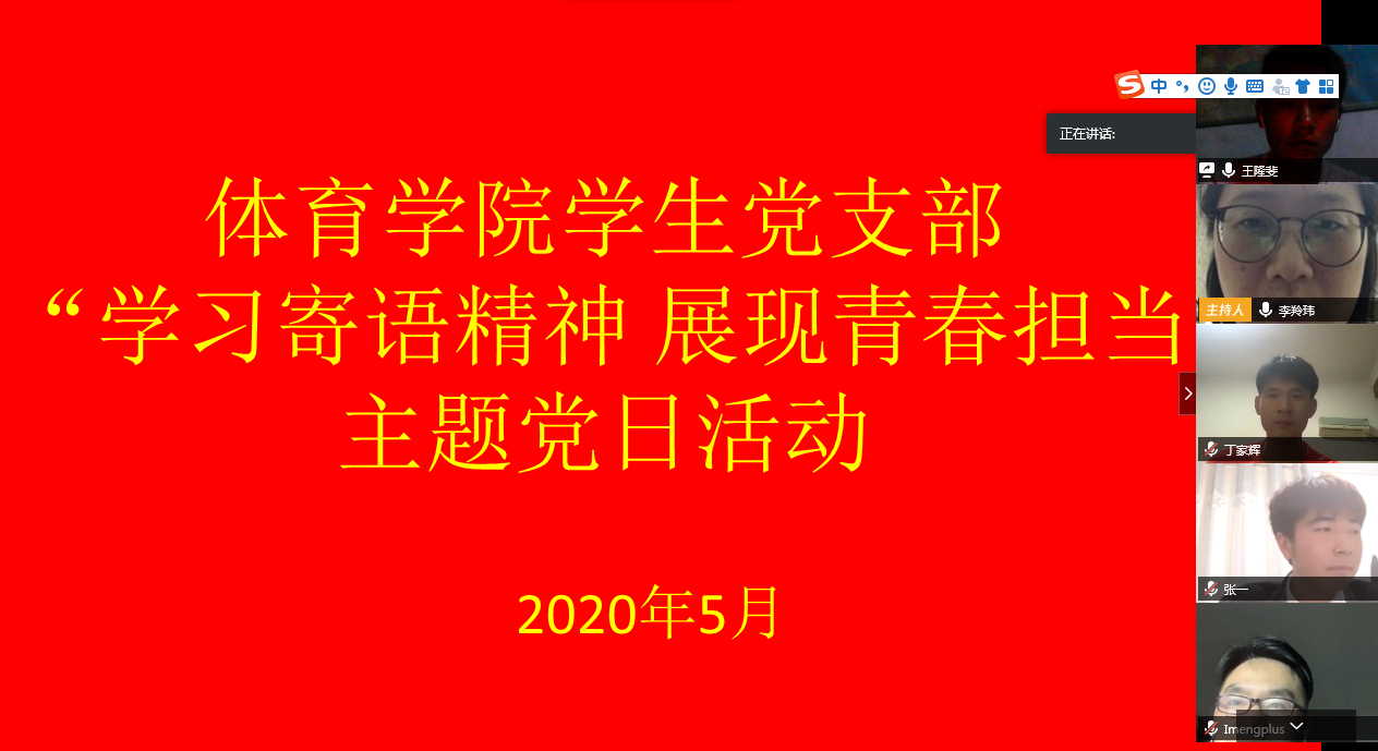 为进一步学习习近平总书记对青年的寄语精神,强化学生青春担当、激发党员的责任意识,落实支部党员帮扶机制,5月12日体育学院学生党支部举行了“学习寄语精神展现青春担当”主题线上党日活动,支部书记李羚玮老师、全体学生党员以及学院各团支部的团干参与此次活动。
