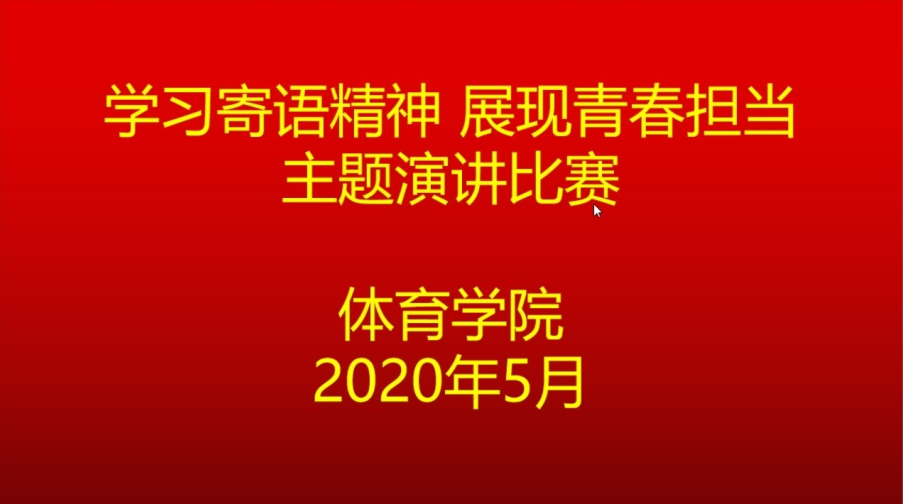 “青春由磨砺而出彩,人生因奋斗而升华。”习近平总书记给新时代青年的寄语在青年学子中引起强烈反响。为深入学习贯彻习近平总书记“五四青年节”对全国各族青年的寄语精神,争做时代进步青年,5月14日下午,体育学院举办了“学习寄语精神 展现青春担当”线上主题演讲比赛。
