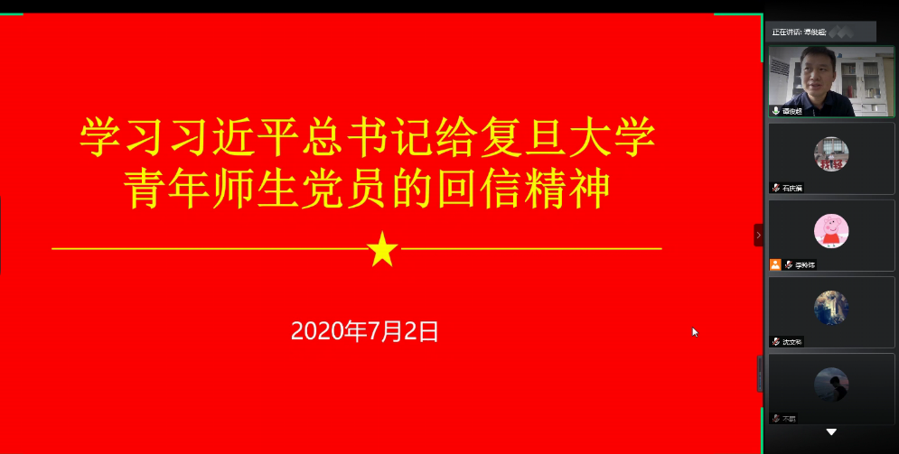 7月2日上午,体育学院利用腾讯会议平台召开了学习习近平总书记给复旦大学青年师生党员回信精神线上学习交流会,集中学习习近平总书记给复旦大学《共产党宣言》展示馆党员志愿服务队全体队员的回信精神。学院党总支副书记、全体辅导员、全体学生党员和学生干部参加了学习。