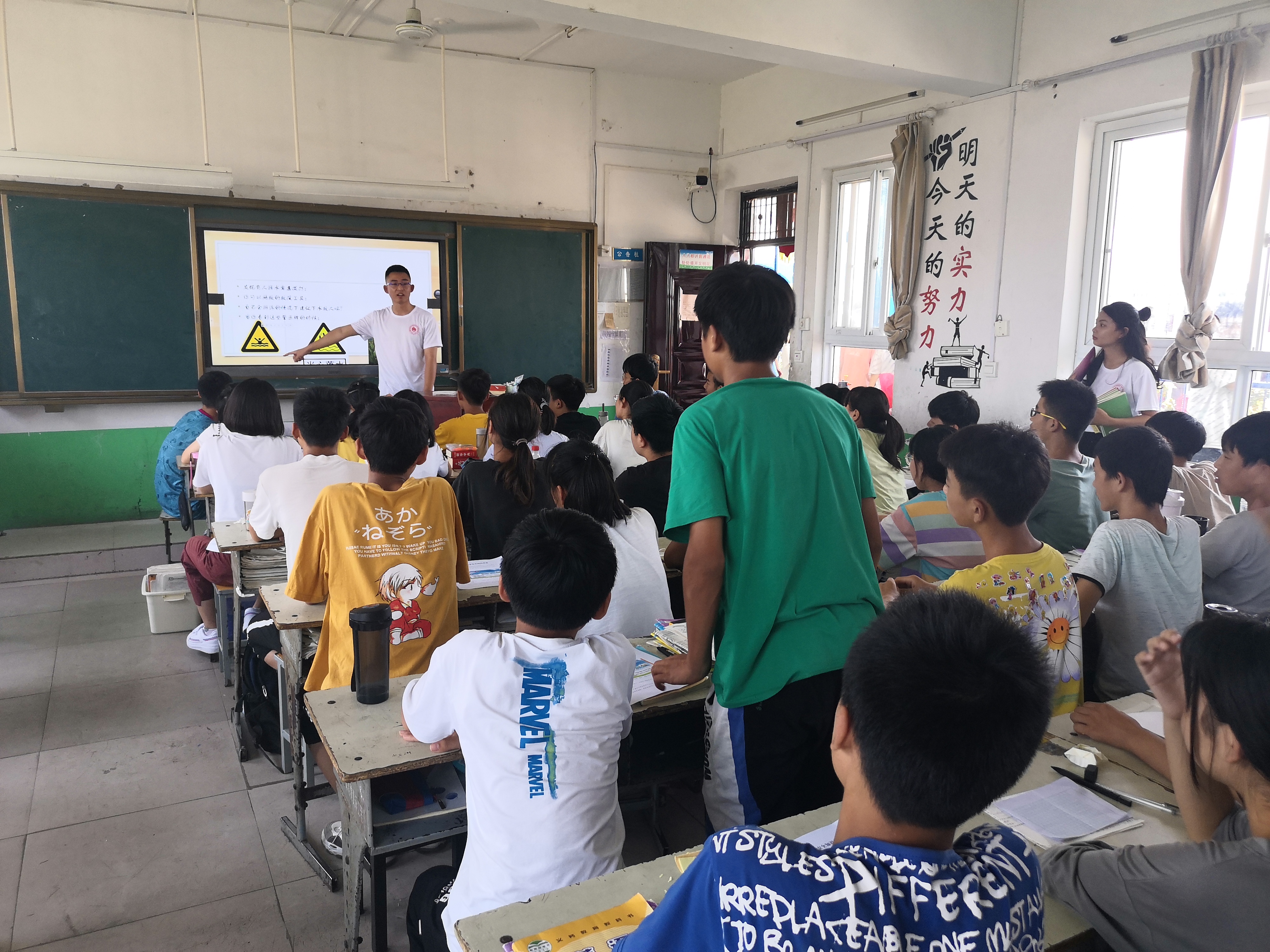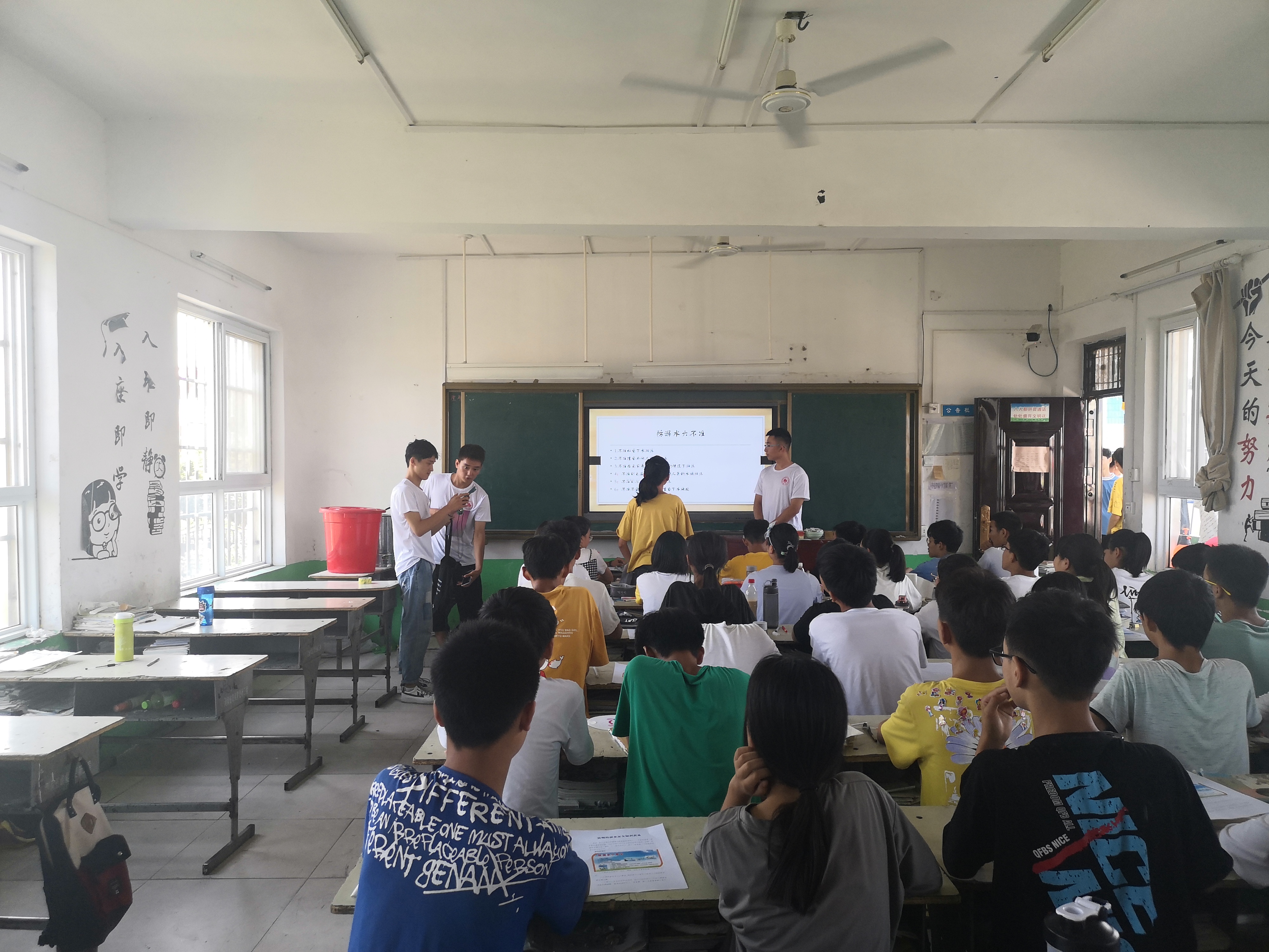 宣讲防溺水,互动转真情。在教室里,队员们通过精心准备的PPT向中学生们集中讲解了暑期防溺水的相关知识。队员们在讲解过程中通过通俗的语言,将知识融入到一个个亲切、通俗、幽默的话语中。通过采用有奖问答的形式,将防溺水知识寓教于乐,为积极参与听讲并参加互动的同学们发放了小礼品。孩子们在欢快的笑声中学习了知识,增强了防溺水安全意识。