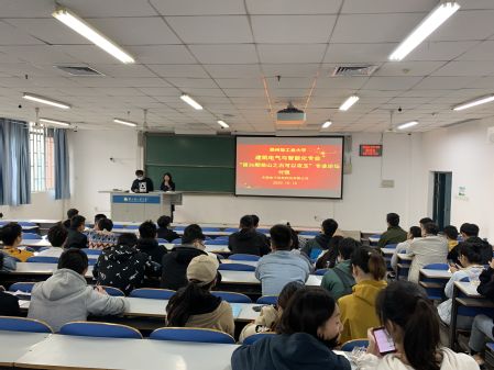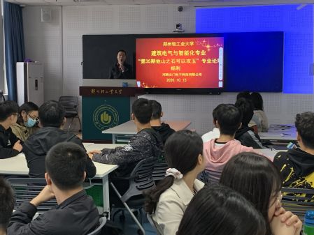 河南云门电子科技有限公司总经理杨利以“专业发展方向”为主题,结合自身多年从业经验,展望了建筑电气与智能化专业的新技术及其应用前景,针对建筑电气与智能化专业发展方向和同学们进行了分享交流,拓宽了同学们的专业知识。中国电科22所天博电子信息科技有限公司国际事业部技术主管付强,以“毕业心路历程分享”为主题,对同学们面临的考研、就业方向、工作单位等方面的困惑和抉择进行了深入交流,解答了毕业班同学所面临的困惑,现场气氛热烈,同学们纷纷表示受益良多。