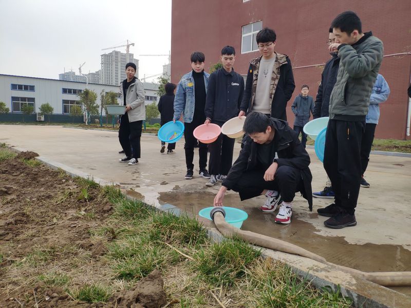 在本次活动中,同学们分工明确,合作积极。在经过一下午的通力协作,完成了对宿舍楼周边所有苗木的浇水任务,并清理了杂草,使道路两旁,山丘上的苗木焕发生机。