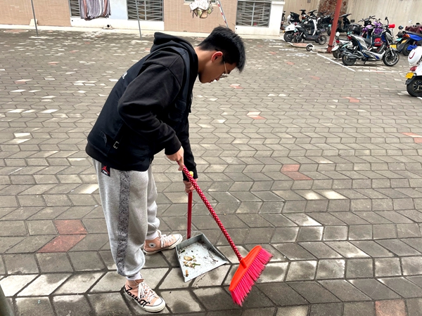上午九点半,志愿者们在图书馆广场集合,同学们拿着扫把,笤帚,跃跃欲试。大家认真清扫小花园、宿舍园区,仔细检查草坪角落,耐心捡着烟头,齐心协力把乱停的车辆归回原位。