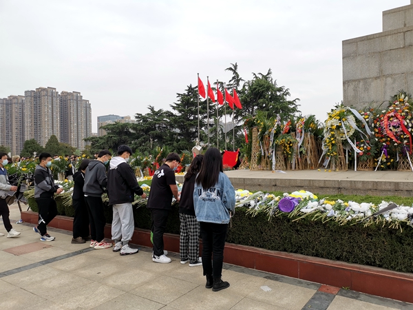 雨停初霁,同学们们列成一队,整齐而有序地走入烈士陵园中。在刻有“革命先烈永垂不朽”的大石碑前,三位同学分别讲述了关于党的历史以及为什么学习党的历史、通过党的历史中学习什么、学习的意义等,并对同学们提出“要牢记历史,不忘初心”、“积极汲取红色精神力量,体会精神内涵”和“发扬斗争精神,承担起自己的责任和使命担当”的号召。在纪念碑前,同学们一起为革命先烈英勇牺牲默哀三分钟。在向烈士纪念碑献花时,同学们都深情鞠躬,把最深情的思念和最崇高的敬意寄托在鲜花中,让它伴在烈士左右。