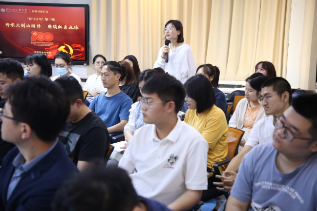 在师生对话交流环节,现场学生就自己关注的大别山精神是如何体现马克思主义理论与中国实际相结合、大别山精神与社会主义核心价值观之间的关系、鄂豫皖三地对大别山精神内涵表述为什么不一致(表述的差异性)、大别山的战略价值与意义、大别山精神在当地是如何体现以及在今天的年轻一代该如何传承、大别山精神与同期的长征精神、延安精神之间是否有赓续关系、红色精神的宣传教育可以采用什么形式等问题展开了激烈的思想交锋与理论碰撞。通过深度讨论,深化了师生对大别山精神的理解,也深刻感悟到“党史”教育的重要意义。