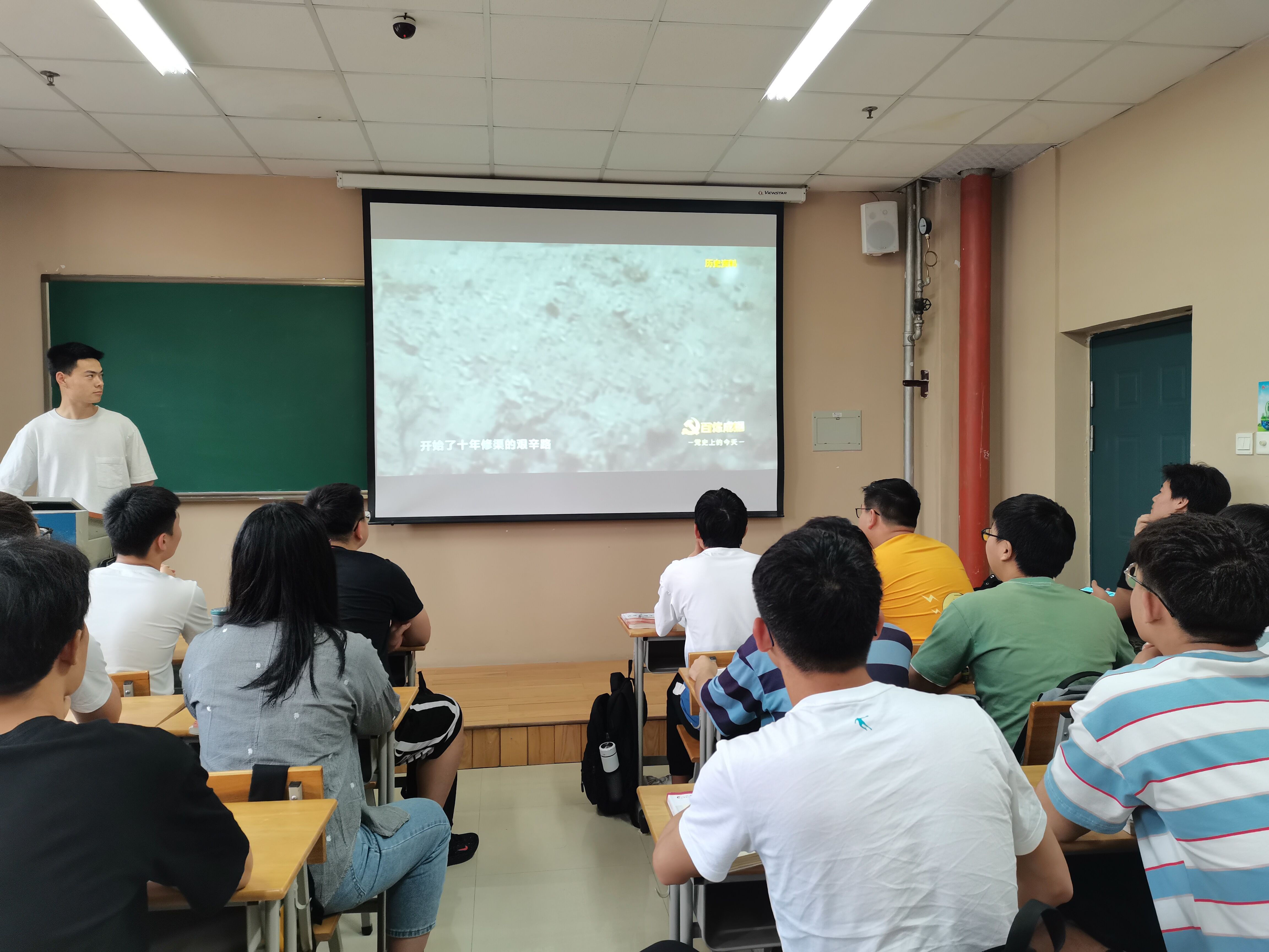 各支部团支书利用课前十分钟组织团支部观看《1960211日:世界第八大奇迹——红旗渠开工》专题片。专题片讲述了上世纪60年代,为改变千百年来缺水的天然困境,林县人民在县委书记杨贵的带领下,在沟壑纵横、悬崖绝壁的太行山上修成长达1500公里的人工天河——红旗渠,改变了过去吃水贵如油、十年九不收的景象,与此同时也孕育了自力更生、艰苦创业、团结协作、无私奉献的红旗渠精神。大家跟随着短片一起了解到红旗渠建造的自然环境之艰难、开工形势之迫切,感受到了共产党人为人民谋幸福的决心和植根于厚重中原文化的红旗渠精神。