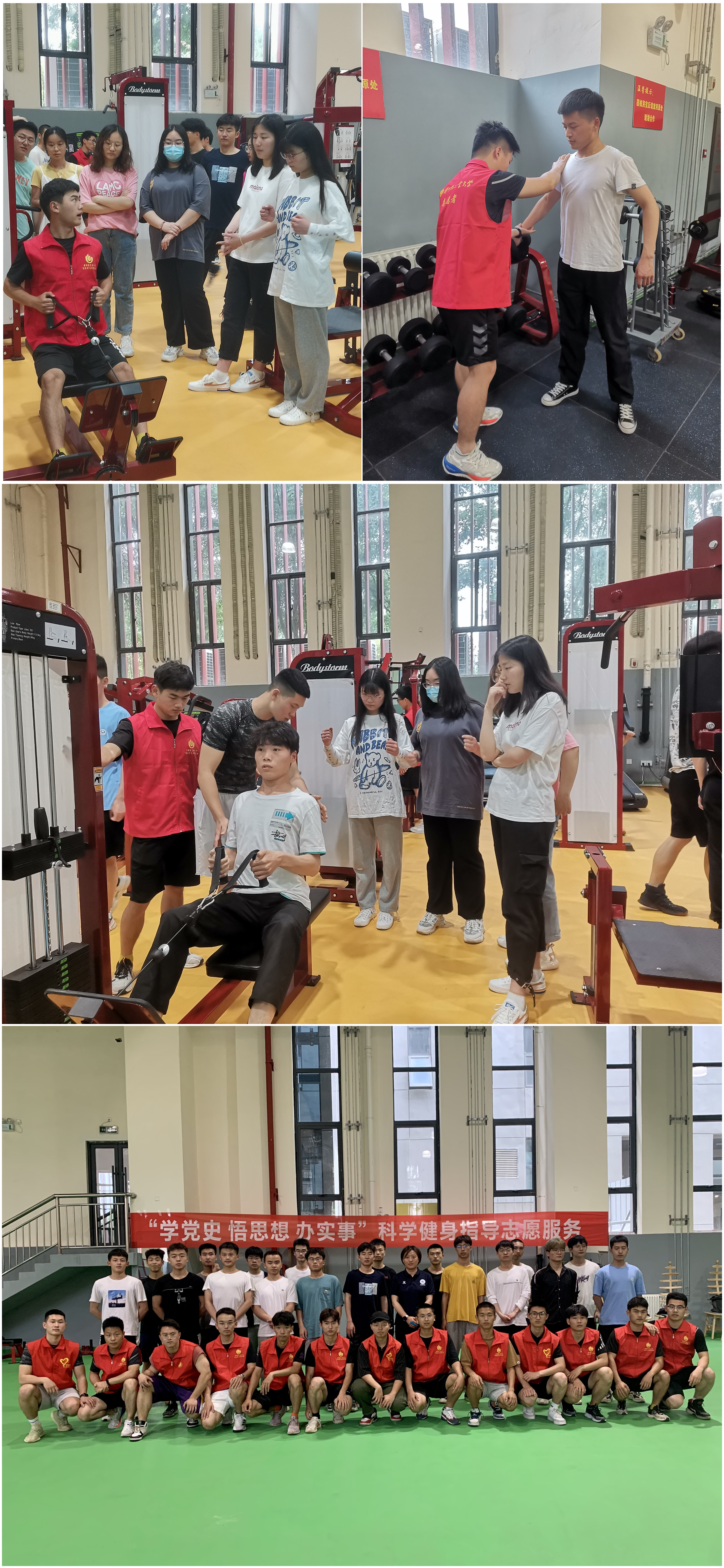活动中,志愿者们指导同学们合理、安全使用健身器材,帮助同学们在安全训练的前提下减脂增肌,进行体形塑造。队员们对健身房组合器械的使用操作流程和方法进行了详细的讲解和示范,并采取循环渐进的方法,由简到繁地讲解健身知识,帮助健身的同学们纠正错误动作,确保大家科学、安全健身。随后,志愿者们耐心解答同学们的在健身过程中的问题和困惑,针对不同体质特点的同学制定个性化健身方案,使同学们在确保安全的前提下快乐轻松健身。