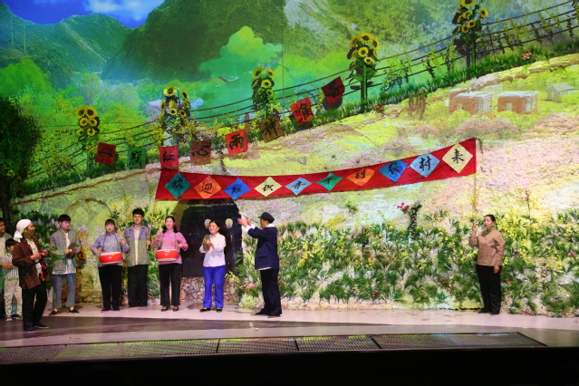 座谈会后,实践队一行在村支部书记的带领下,来到垌头村大剧院,观看了由村民自编、自导、自演的大型沉浸式实景体验剧《再现朝阳沟》,演出内容以杨兰春先生原著《朝阳沟》剧情为基础进行艺术化改编,汇集戏曲、舞蹈、话剧、歌曲等多种艺术形式,并加入本地多种非遗民俗文化艺术表现元素。演出所有演职人员都是附近村民,他们朴实、热情、投入,呈现出一场精彩纷呈的演出,每个人脸上都洋溢着幸福和自信。