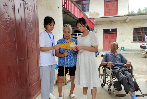 入户走访困难家庭,传递温情暖人心。7月10日,外国语学院“筑梦使者”实践小队成员来到河南省南阳市杜旗县李店镇青台栗盘村开展实践活动。小队志愿者带着牛奶、水果、米等慰问品来到了困难同学的家中。走访过程中,志愿者详细地询问了受访同学的家庭情况、生活状况并通过宣传手册向他们详细地介绍了国家对于困难生家庭的资助政策,让他们对资助政策有了更清楚的了解。