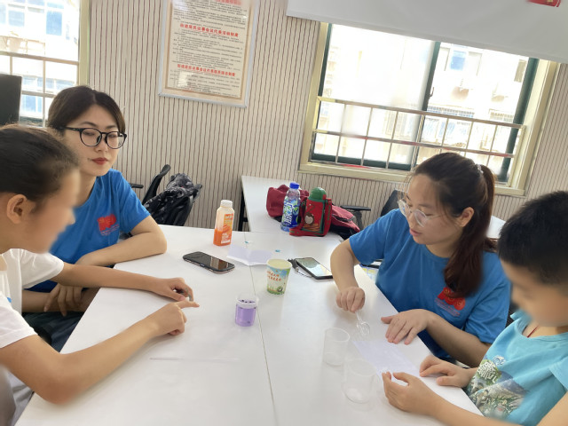 7月13日,志愿服务队来到南阳新村党群服务中心,利用暑假时间为困境儿童开展课业辅导、手工制作、绘本阅读、科学实验等形式多样的主题活动。“这两个数加在一起,就可以得到答案了对吗?”在得到志愿者肯定的回答后,小朋友高兴得拍起了小手,这是护童活动的现场剪影。志愿者与小朋友两两结对,或是做手工或是学习数学英语等学科知识。对于志愿者而言,与这群特殊的小朋友沟通、引导他们学习,并非易事。有的志愿者第一次接触“来自星星的孩子”,被深深地震撼了,这些孩子幽居在自己的世界里,无限的天真,有的孩子十几岁了,仍然在学习如何与人打招呼。他只用一双明亮但茫然的眼睛看着你,却不愿用只言片语回答提问。孩子与初次相遇的志愿者之间仿佛隔着一条“真空地带”。面对这些特殊的孩子,志愿者们需要极大的爱心、耐心和决心,即便教简单的一个词、一句话、一个动作,他们都要不断地重复、重复再重复。就算无法听清、理解孩子们的言语,志愿者们也始终在尝试与孩子们沟通。对于部分孩子而言,先天性的智力发育迟缓让原本简单的知识变得难以理解。志愿者们表现出极大的耐心与满满的温柔,不厌其烦地讲解着同一个知识点,直到孩子理解为止。而面对活跃的孩子,志愿者则及时肯定、积极引导学习,稳定其情绪。