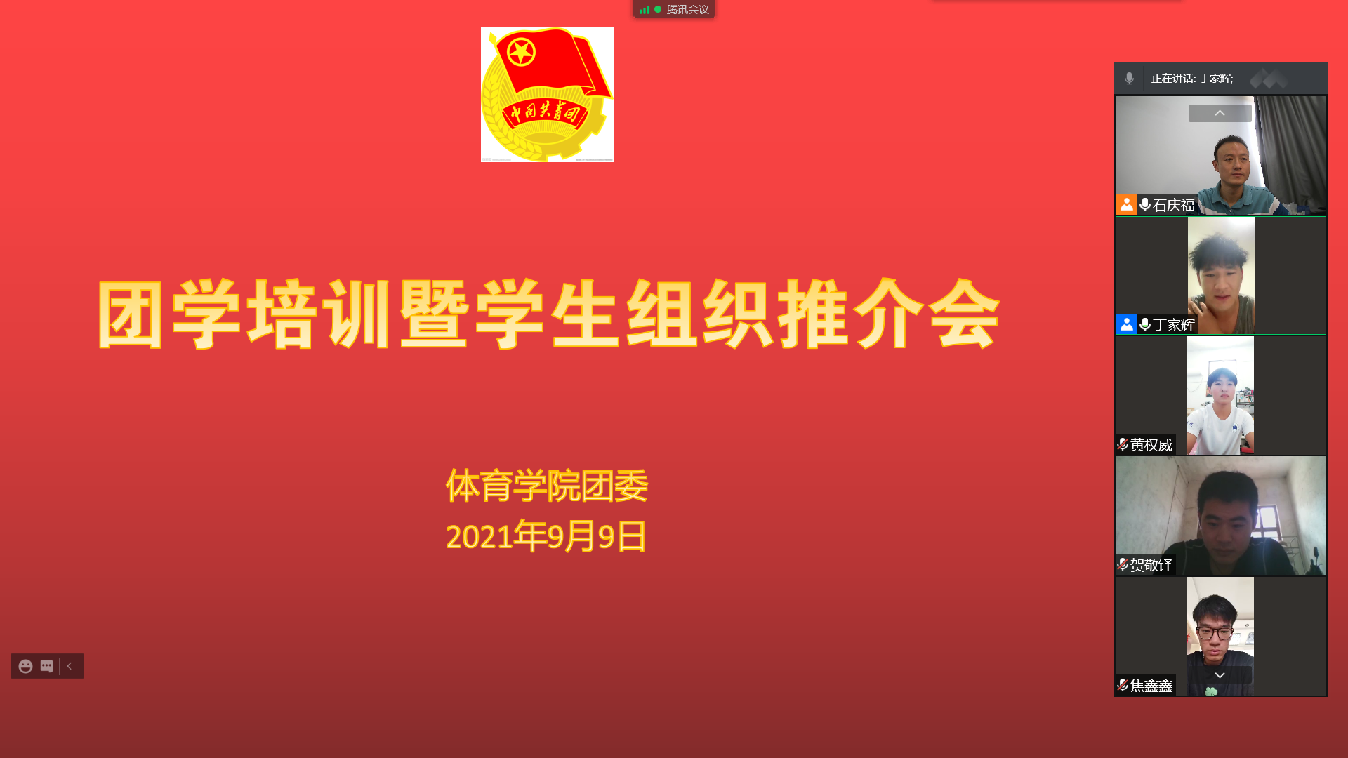 为了帮助2021级新生尽快融入大学生活,9月9日上午,体育学院利用腾讯会议,面向新生线上召开了团学培训暨学生组织推介会。体育学院团委书记石庆福、各团学组织学生负责人及2021级全体新生参加了此次会议。