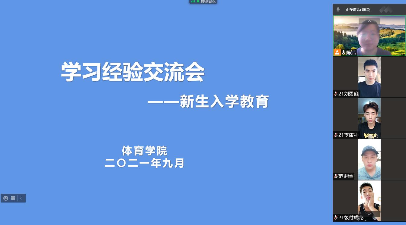 为持续加强学风建设,帮助新生尽快适应大学生活,9月11上午,体育学院利用视频会议的形式召开新生学习经验交流会。学院学工办副主任陈洁老师和2021级全体新生参加了此次会议。