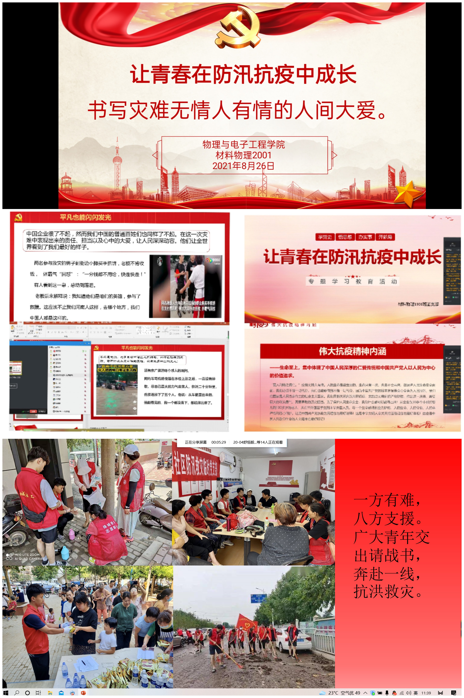 为深入学习贯彻习近平总书记“七一”重要讲话精神,引导广大团员做新时代有担当、敢作为的爱国青年。8月下旬以来物理与电子工程学院各班团支部组织开展了“让青春在防汛抗疫中成长”系列主题团日活动。
