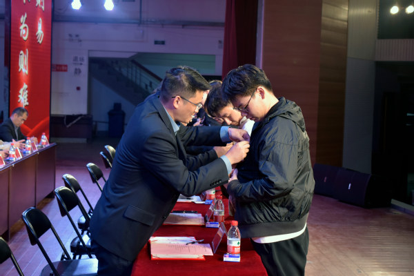 随后,学院领导为2021级新生代表佩戴校徽。会议宣读了《材料与化学工程学院关于聘请杨皓然等13名同志担任本科生班主任的决定》,并为班主任颁发聘书。