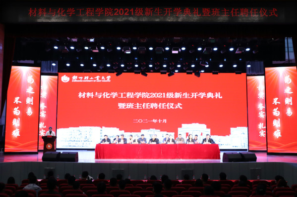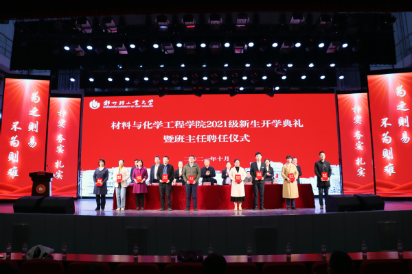 10月22日晚,材料与化学工程学院在东风校区大礼堂隆重举行2021级新生开学典礼暨班主任聘任仪式。学院党政领导、各系(中心)主任、全体辅导员、新生班主任以及2021级全体新生参加了本次典礼。典礼由学院党委副书记司丽娜主持。