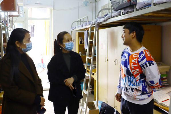 在检查过程中,对安全隐患、宿舍卫生、物品摆放等进行了进行,对检查出的问题,及时指出整改方向和整改方法。老师们与学生进行交谈,向学生了解宿舍生活情况,询问考研学生复习状况、低年级学生课堂情况等,对学生提出的问题,认真给予解决。经检查发现,大部分宿舍的总体情况较好,地面无杂物堆积,房间干净整洁,物品摆放有序,但个别宿舍存在乱扯插线板等情况,少部分宿舍有不整洁现象。同时,老师们通报了近期郑州疫情相关情况,着重强调了学校疫情防控工作的有关要求,提醒大家要提高疫情防控意识,做好个人防护,坚持“非必要不外出”原则,勤洗手,常通风,特殊情况务必及时上报。