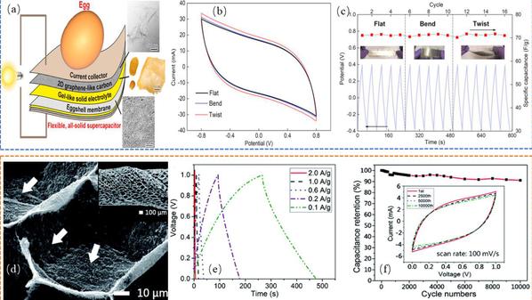 在众多的储能器件中,超级电容器因具有高的功率密度、长的循环寿命、快的充放电速率和安全的操作条件等诸多优势,被认为是最有前景的储能器件。然而,柔性超级电容器的开发还面临着一系列科学和技术上的难题,其储能性能和实用性与电极材料、电解质、器件结构都有重要关系:除了同时具有高能量、功率密度,超长的循环寿命,充电时间短等优点外,还需具有体积小、质量轻、可弯曲、可拉伸、可编织等一系列的特点。这些性能优点使得柔性超级电容器可以与可穿戴电子设备的其它功能模块集成于一体,以真正达到可穿戴的目的。