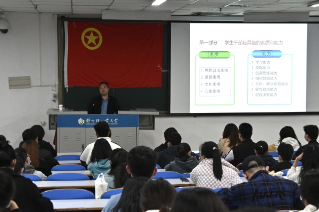 活动伊始,宋书记介绍了团课培训的重要意义,希望广大团学骨干把握机遇、认真学习,坚定理想信念,加强品德修养,不断提高认识,加强作风建设,增长知识技能,增强综合素质。接着,宋德涛老师围绕“让青春在奋斗中激扬”这一主题,从学生骨干应具备的素质和能力、新形势下应树立的思想政治观念、如何树立较高威信、如何当好学生干部、学生干部工作原则和正确处理几方面关系等六个方面讲述了如何成长为一名优秀的团学骨干。宋书记指出团学骨干部应具有良好的思想政治素质、道德素质、学习和交际等能力;应具备公仆意识、民主意识、开拓意识、参与意识,积极为同学服务;要树立较高威信,以身作则,善于团结、协调指挥,明确职责、精通业务。宋书记还结合具体事例,详细列出了团学干部的几种不良倾向,并希望团学干部能处理好专业学习和学生工作的关系;发挥好团学干部的带头模范作用;注重积累、厚积薄发,在实践中提升能力;坚定信仰,勤奋学习,听党话、跟党走,敢于做梦、勤于追梦、勇于圆梦,为实现中华民族伟大复兴贡献青春力量。最后,宋书记围绕马克思主义宗教观基本内容、党的宗教工作方针政策以及我校关于宗教工作的相关制度规定等多个方面,进一步引导广大团学骨干树立正确的马克思主义宗教观,在任何情况下做到政治信仰不改变,理想信念不动摇,坚决抵制宗教向校园渗透,努力营造人人知晓党的宗教政策和国家宗教法律法规的良好氛围。