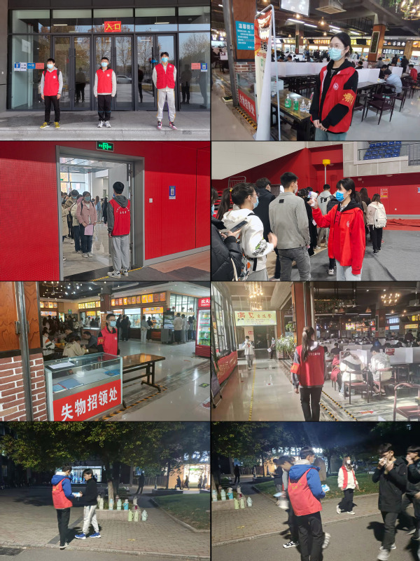 在本次志愿活动中,志愿者按照值班要求,在各个教学楼、图书馆、宿舍楼区、食堂等人流较为密集的地方进行监督。当值的志愿者对口罩佩戴不当的同学进行提醒,为没有佩戴口罩的同学发放口罩,严控人员聚集。在教学区,志愿者们引导和提醒上课师生佩戴好口罩、保持安全距离。在餐厅,志愿者在各楼道口、餐具回收处进行防疫监督,督促前来就餐的同学带好口罩,提醒同学们文明用餐,同时推动着光盘行动意识的普及。在宿舍区,为了保障隔离在宿舍同学的正常生活,志愿者们每天为他们买饭、打热水送到宿舍门口,用实际行动温暖了同学的心。在疫苗接种区,志愿者们积极引导疫苗加强针的进行,维持公共秩序,让疫苗加强针的接种顺利进行。