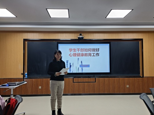 郭老师首先通过“认识自己”热身活动开始,逐渐引申到大学生心理健康教育工作的内涵以及重要性;通过详实的案例,从正常心理和异常心理的区分、心理疏导的方法等方面深入细致的讲解了如何区分一般心理问题和严重心理问题以及如何通过“心理疏导五步法”对同学进行询问、倾听、提问、区分和引导。同时,郭老师还从人际关系、环境适应、学业压力等方面,就校园中发生的典型心理危机案例进行深入分析,进一步帮助大家了解心理问题产生的原因。最后,她强调,学生干部一定要关心同学、关心集体,对班级同学的心理状况进行管理和监督,发现隐患及时向老师反映,并就心理晴雨表的填写、前期各班级心理主题班会召开情况进行了说明和分析。
