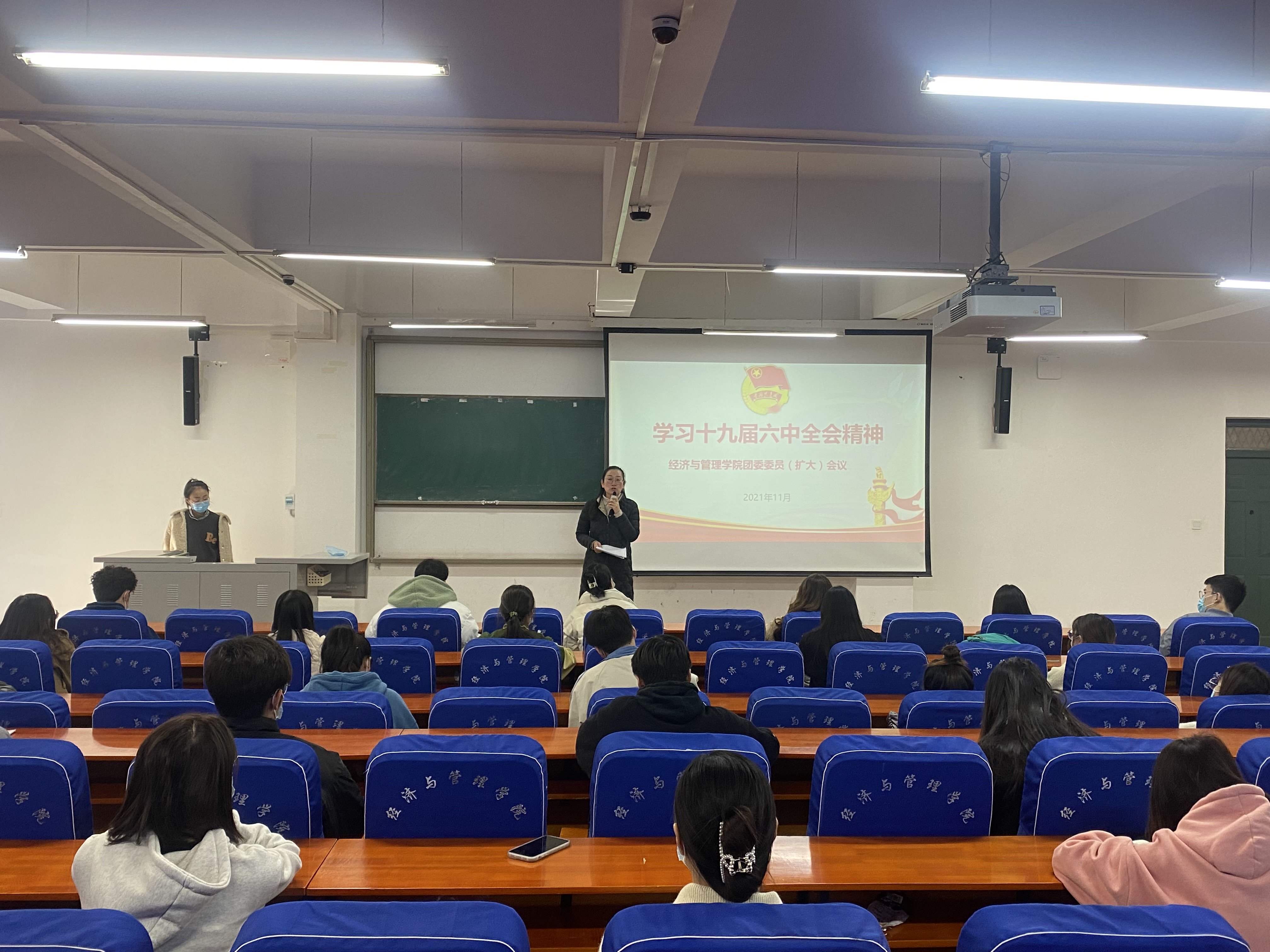 为深入学习贯彻党的十九届六中全会精神,深化拓展党史学习教育,经济与管理学院于11月29日中午在经管楼211室开展学习十九届六中全会精神团日活动。学院团委书记姚少华老师、青马班学员和各级团学干部代表参加了本次会议,21级团学干部同步在线上通过腾讯会议进行观看学习。