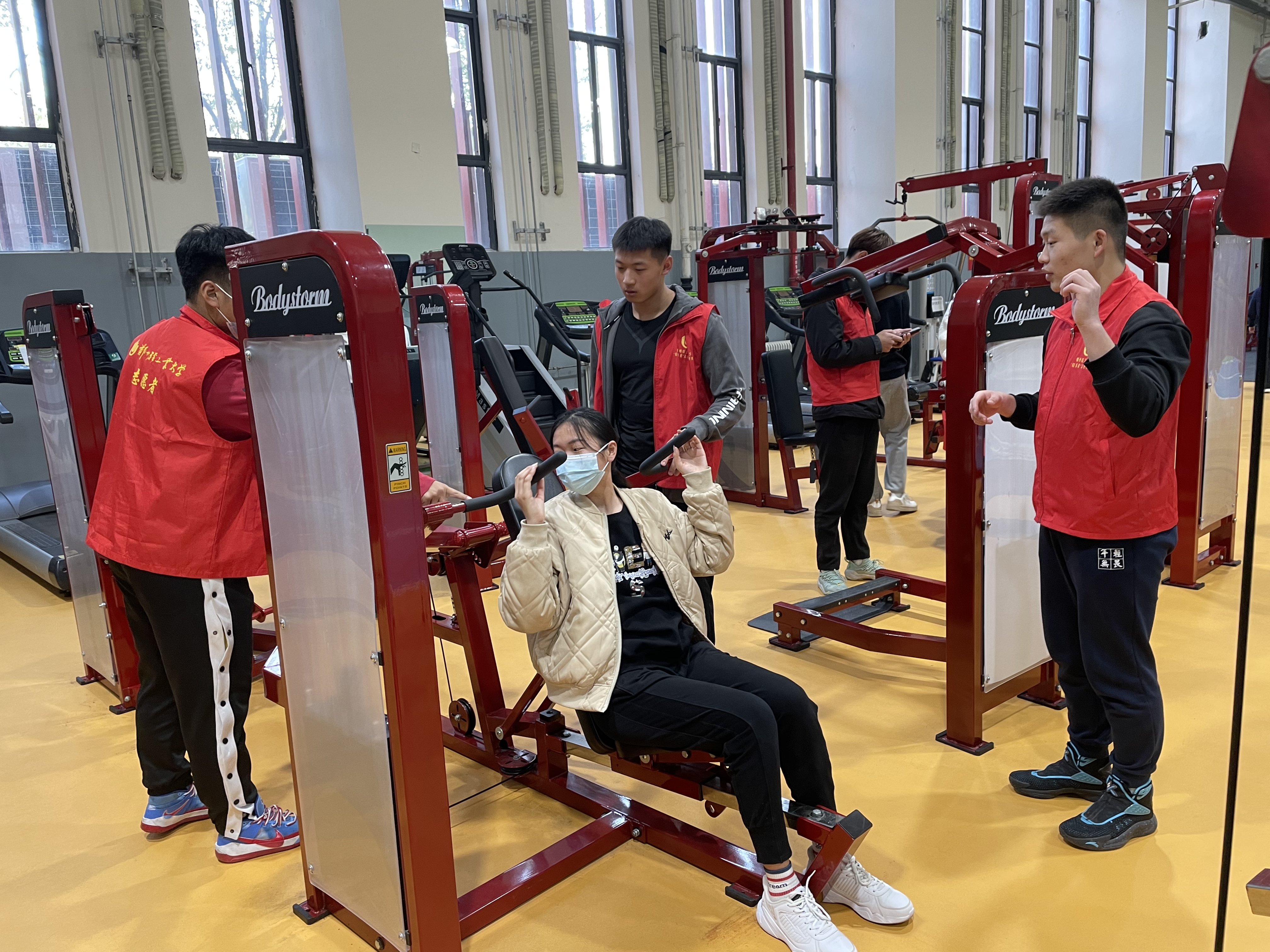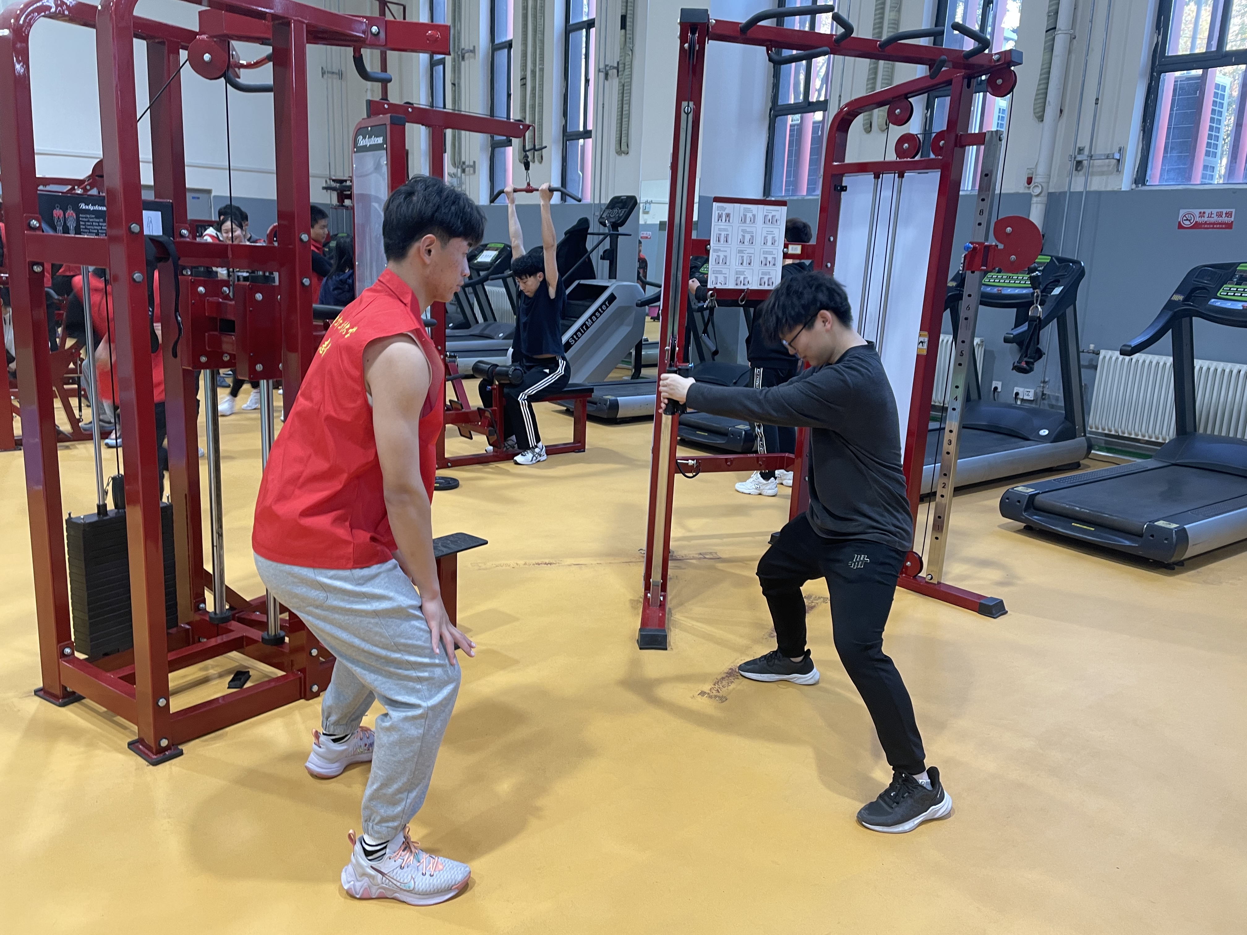 活动中,志愿者们指导同学们合理、安全使用健身器材,帮助同学们在安全训练的前提下减脂增肌,进行体形塑造。志愿者们采取循环渐进的方法,由简到繁的讲解,帮助同学们纠正错误动作,并针对不同健身目的和需求同学们提出具体健身方案,确保大家科学、安全健身。现场的健身爱好者们认真聆听志愿者们的讲解,仔细观看志愿者们的动作示范,深入了解了健身过程中器械使用、安全、负荷、强度、保护等知识。