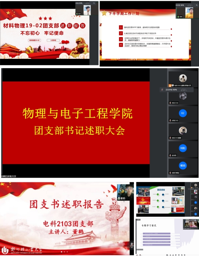 为加强基层团组织建设,抓好团干部队伍建设,激发团支部活力。12月15日晚,物理与电子工程学院在四教510会议室召开了团支书述职评议大会,团委书记周芳华老师、各班级团支书参加了本次会议,会议采取线上线下结合的形式进行。