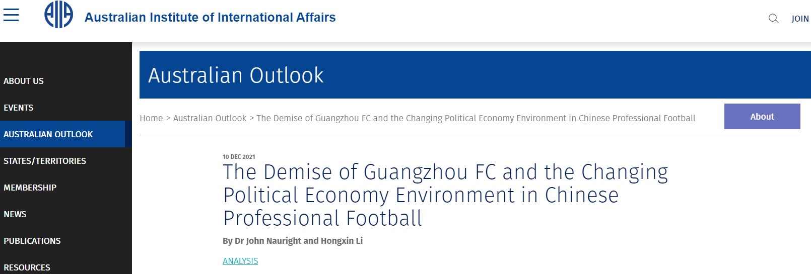 近日,体育学院新进教师李鸿昕博士与美国圣玛丽山大Richard J. Bolte, Sr.商学院院长约翰·诺瑞德教授一起在澳大利亚国际事务研究所杂志《Australian Outlook》上就中国职业足球俱乐部目前所面临的问题发表了一篇分析报告。该文章运用体育政治经济学(Political Economy and Sport)的理论框架,谈论了广州足球俱乐部目前面临的危机,分析了中国职业足球问题产生的原因,同时也介绍了新时期中国职业足球稳定发展、改革创新的决心,提出了职业足球在中国以及国际新兴市场的发展方向。
