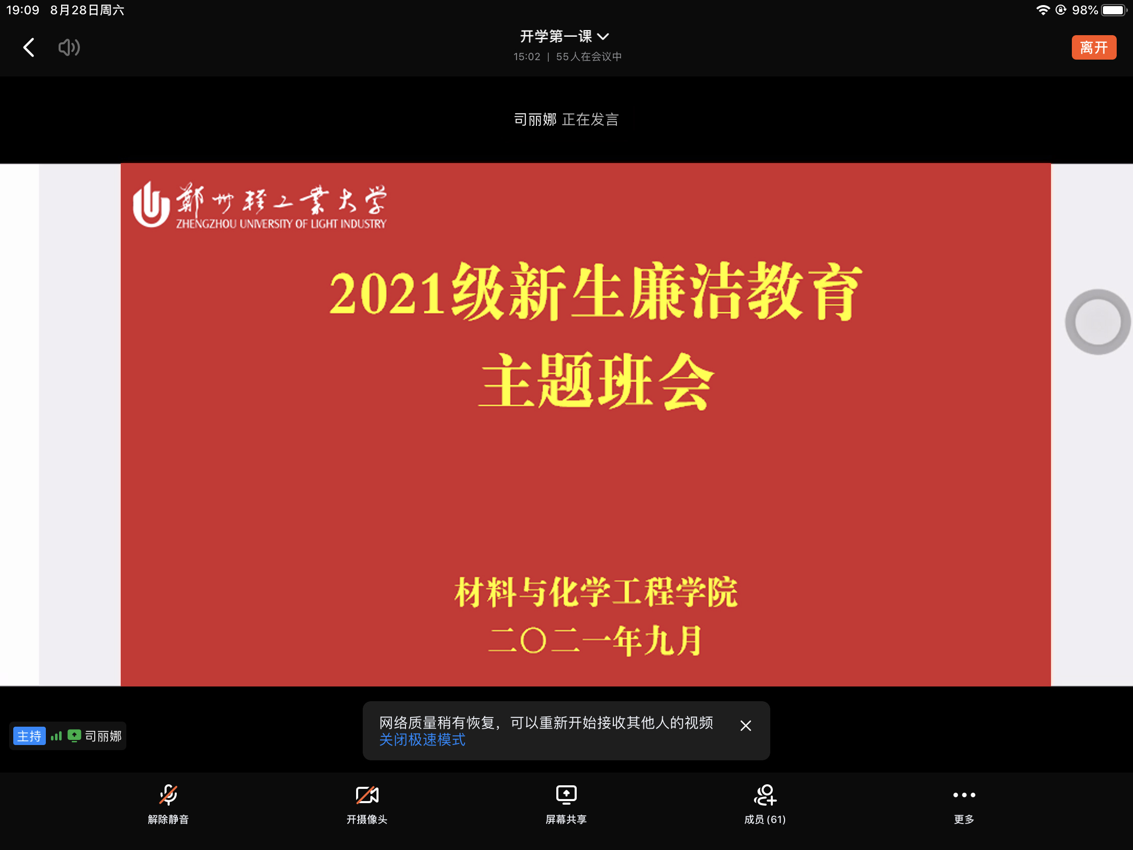 为深入落实大学生党风廉政教育,教育引导新生扣好“人生第一粒扣子”,上好廉洁“第一课”,把好廉洁“第一关”,切实做好入学教育相关工作,材料与化学工程学院于9月16日开展2021级新生廉洁教育主题班会,党委副书记司丽娜、新生辅导员和四百余位学生参与此次线上视频班会。