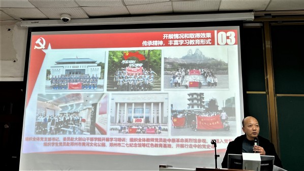 会上,王延峰总结了学院党史学习教育开展情况。一是读史学史,认真开展理论学习。通过召开理论中心组(扩大)专题学习会、支部党员大会、开展主题党日,集中组织学习,从党的历史中汲取精神力量和智慧养分;二是学史讲史,扩宽学习教育渠道。组织开展“学党史庆百年讲党课 守初心践使命齐育人”微党课比赛,组织优势力量录制推广微党课,辅导员全面开展党史微宣讲,教师党员结合专业课程讲党课,形成了全员参与、全员受教育的良好学习氛围。三是传承精神,丰富学习教育形式。组织师生参加学校庆祝建党一百周年大合唱比赛,组织全体党支部书记、委员赴大别山干部学院开展学习培训,利用好校外教育基地开展行走中的党史课,引导师生感悟初心使命,传承红色精神。四是做实事好事,践行学习教育要求。积极协调解决师生急难愁盼的实际困难,动员师生主动参与志愿服务,担当社会责任。五是促事业发展,检验学习教育实效。学院在教育教学、学科建设、人才培养、党建思政等方面取得显著成绩。