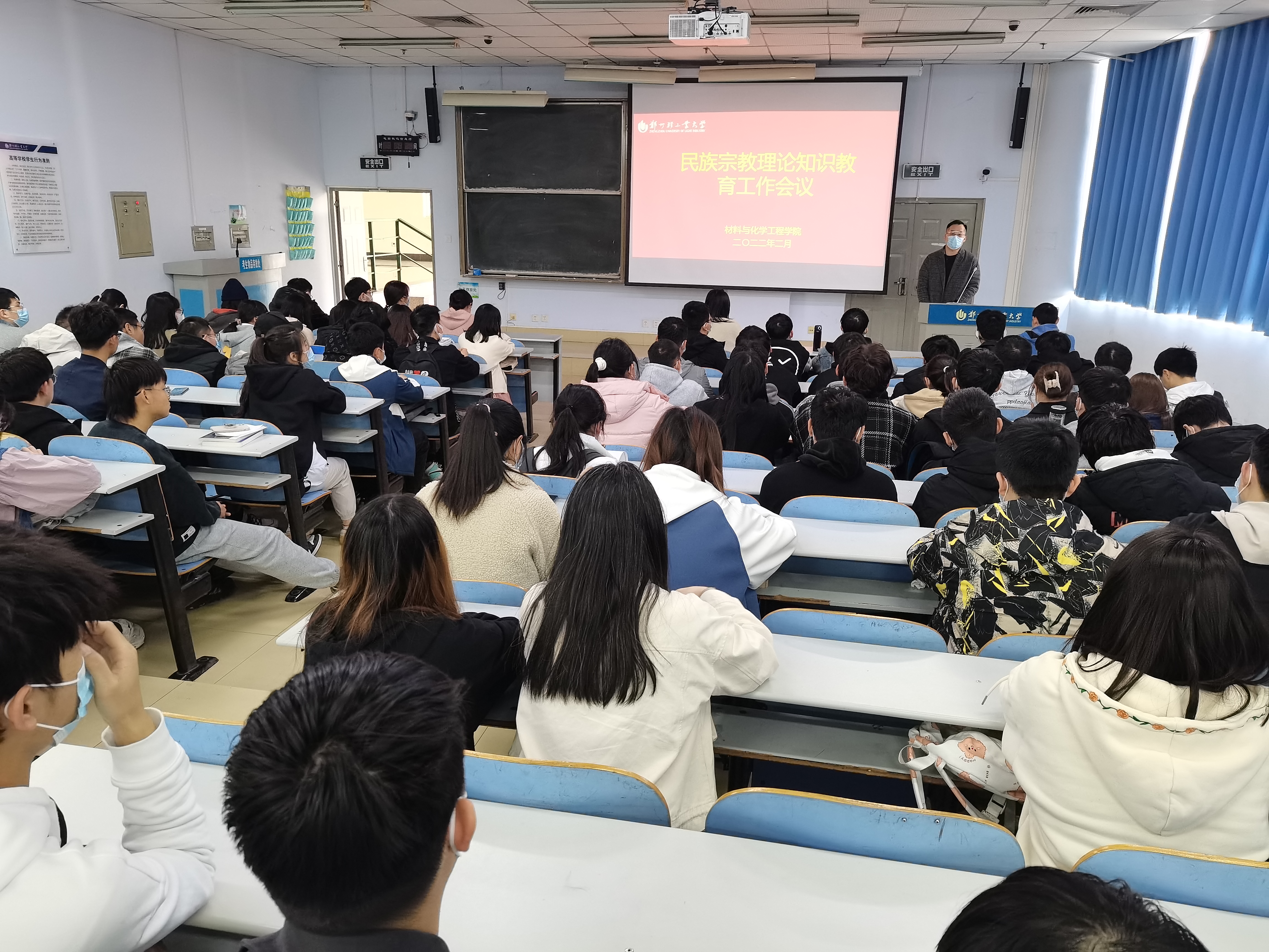为深入贯彻落实党的民族宗教工作方针政策,引导学生树立正确的马克思主义民族观、宗教观,正确认识和处理涉及民族宗教等方面的问题,进一步铸牢中华民族共同体意识。材料与化学工程学院于3月7日在教三楼100开展了民族宗教理论知识宣传教育,2021级班委、宿舍长参加了本次活动。