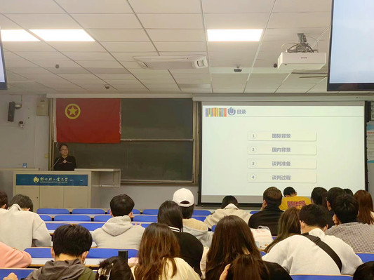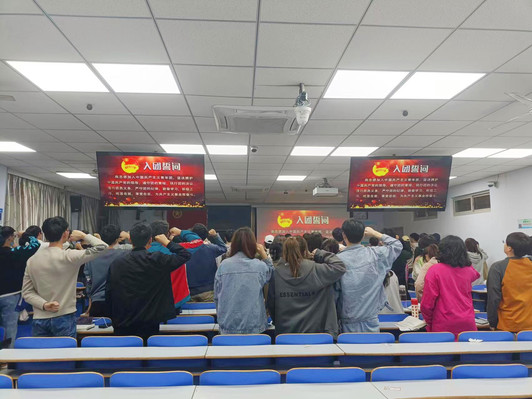 张老师以“重庆谈判 谈打结合”为主题,带领大家重温了重庆谈判过程的艰难曲折。采取“自然渗透 润物无声”的方式,讲述了重庆谈判是人民力量的一次胜利,影响了以后中国革命的历史进程,引导广大青年学子学史明理、学史增信、学史崇德、学史力行;讲述了从播下革命火种的小小红船,到领航复兴伟业的巍巍巨轮,引导学生坚定理想信念,厚植爱国主义情怀。最后,重温入团誓词,铭记初心使命。“我志愿加入中国共产主义青年团,坚决拥护中国共产党员的领导,遵守团的章程,执行团的决议,履行团员义务……”在鲜红的团旗下,在场全体成员庄严举起右拳,温誓词、忆初心,一字一句,铿锵有力,催人奋进。