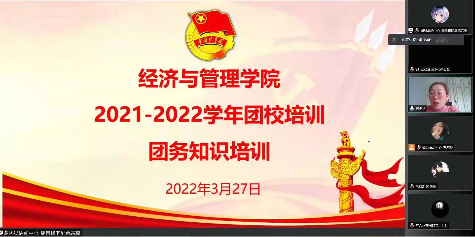 为巩固学院基层团组织工作基础,推进基层团组织规范化、科学化、信息化水平建设,提升基层团干的能力素质。3月27日下午,经济与管理学院线上举办了18-21级“基层团干能力素质提升”团校培训班,经济与管理学院团委书记姚少华老师和学院各级团学干部参加了本次会议。