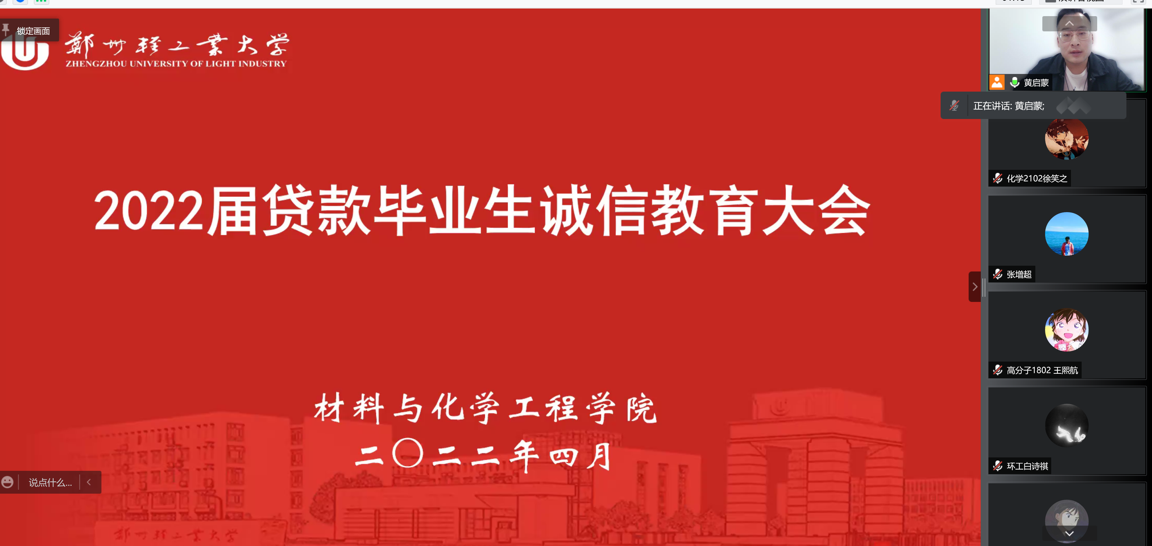 为进一步落实国家助学贷款政策,加强毕业生诚信教育4月4日中午材料与化学工程学院通过腾讯会议平台召开了2022届贷款毕业生诚信教育大会。会议由负责学生资助工作的黄启蒙老师主持,全体校园地贷款毕业生参加会议