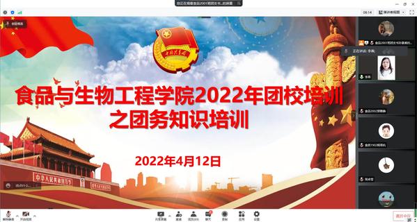 为进一步加强基层团干部队伍建设,切实提升服务青年的能力和水平,4月12日中午,食品与生物工程学院举办线上“基层团干能力素质提升”培训会,学院团委书记李燕、各年级团学干部参加了本次会议。