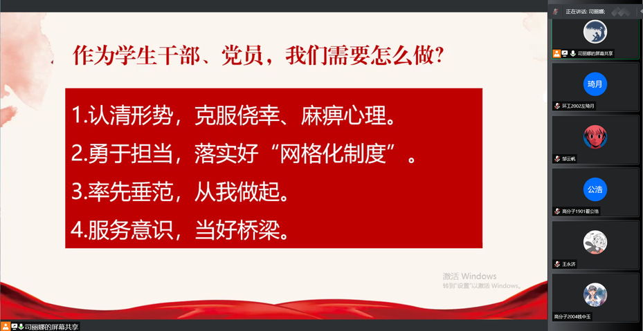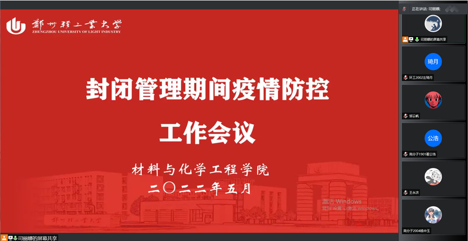 为更好地开展疫情防控工作,增强学生战胜疫情的决心,同时进一步发挥学生党员干部在疫情防控中先锋模范作用,5月5日中午,材料与化学工程学院通过线上召开封闭管理期间学生党员、网格长会议。学院党委副书记司丽娜主持会议,全体辅导员、学生党员、网格长参与了此次会议。