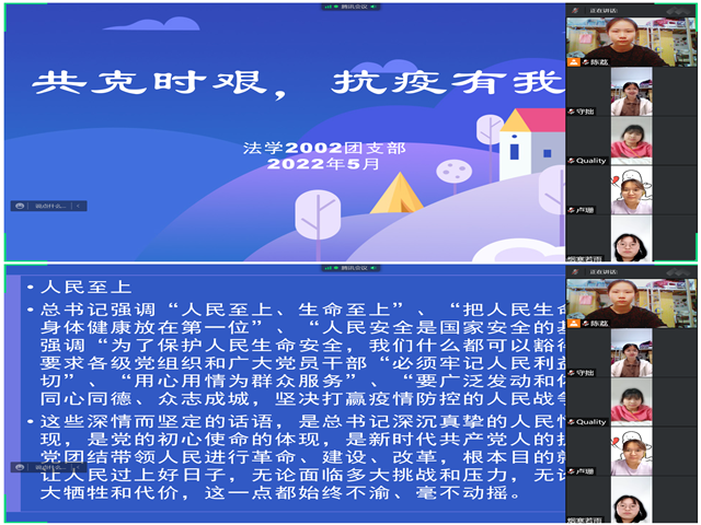 为深入贯彻落实习近平总书记关于疫情防控工作的重要讲话和指示精神,积极配合我校防疫工作,引导团员青年提升个人防护意识,5月9日-5月15日,政法学院各团支部开展“共克时艰,抗疫有我”疫情防控线上主题团日活动。