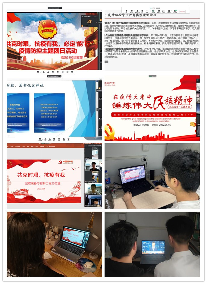 近日,郑州突发新冠肺炎疫情,形势严峻。为保障师生安全,贯彻落疫情防控工作,学校决定对科学校区进行封闭管理,全校师生迅速拉响疫情阻击战的战斗警报。面对这场关乎全校师生安危的战役,能源与动力工程学院团委迅速行动,落实防疫政策,第一时间组织师生携手抗击疫情,拉起疫情防控的坚实防线,为校园和谐稳定筑牢堡垒。2022年5月,能源与动力工程学院组织各团支部开展“共克时艰,抗疫有我”疫情防控主题团日活动。