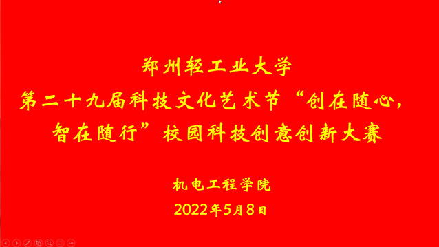 为提高广大学生的创新意识,激发学生创新潜力,挖掘优秀的创新创业团队,为学生参加科创大赛做好人才储备,5月8日下午,由校团委主办、机电工程学院承办的第二十九届科技文化艺术节“创在随心,智在随行”校园创意创新设计大赛在线上成功举办。我校全日制本科生、研究生参与此次大赛。