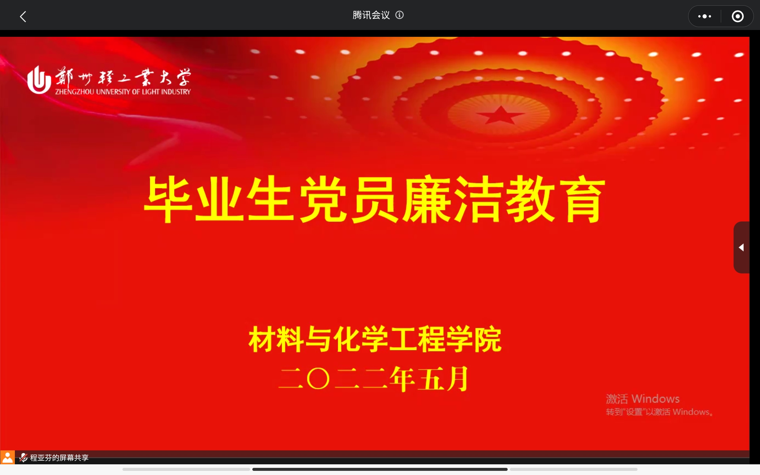 在2022届毕业生即将离校之际,为切实加强毕业生文明离校教育,引导毕业生树立廉洁修身的品行,材料与化学工程学院召开2022届毕业生党员廉洁教育大会,学院党委副书记司丽娜、组织员程亚芬以及全体2022届毕业生党员参加。