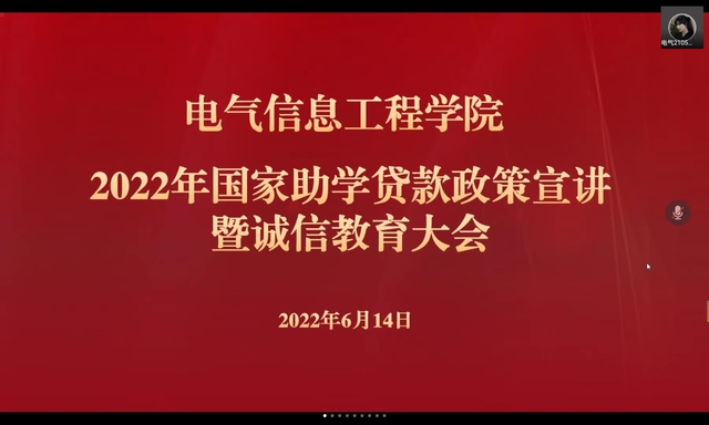 为进一步向同学们宣传国家资助政策,使同学们进一步了解国家助学贷款流程,加强大学生诚信、感恩教育。电气信息工程学院于6月14日在线上召开2022年国家助学贷款政策宣讲暨诚信教育大会,学院负责资助工作的老师刘丰阳,学院资助宣传大使团队成员以及贷款学生参与此次会议。