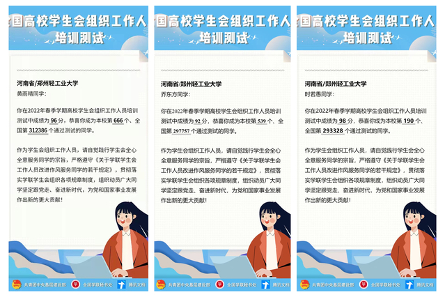 高校学生会组织工作人员培训测试系统由共青团中央基层建设部、全国学联秘书处联合推出,通过统一测试题库自动生成50道题目,参与测设的同学通过中华全国学联微信公众号登录系统在线完成,测试完成后自动生成测试结果,并可查看答卷和领取相关学习资料。测试过程中,每位学生会工作人员高度重视次相工作,积极参与其中,在自我检验的同时,巩固已掌握的知识,也在汲取新的养料,更不忘弥补自身的不足,以考促学,学以致用,学校全体学生会工作人员顺利完成所有题目,通过率100%。