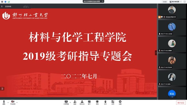 为进一步帮助2019级考研学子了解考研形势,明晰考研目标,解决当前考研困惑,7月4日,材料与化学工程学院通过腾讯会议分专业举办“2019级考研专题指导会”,各专业辅导员、班主任以及2019级考研学子参加本次会议。